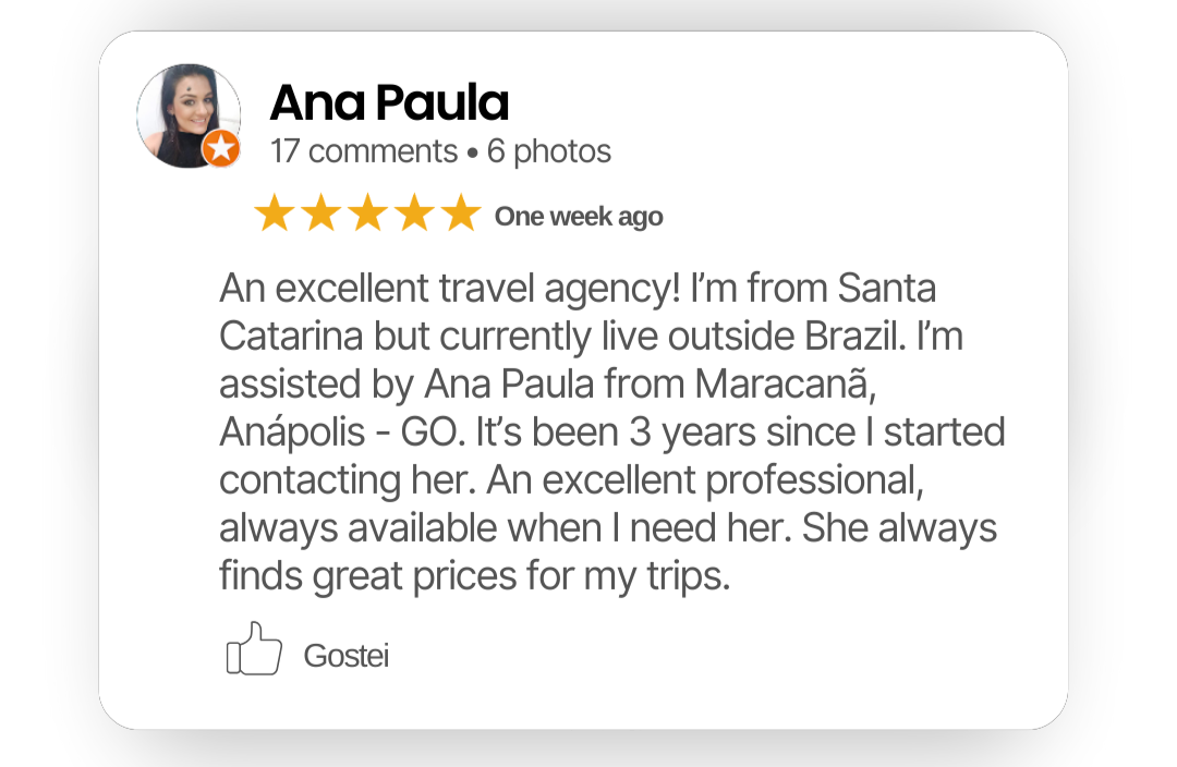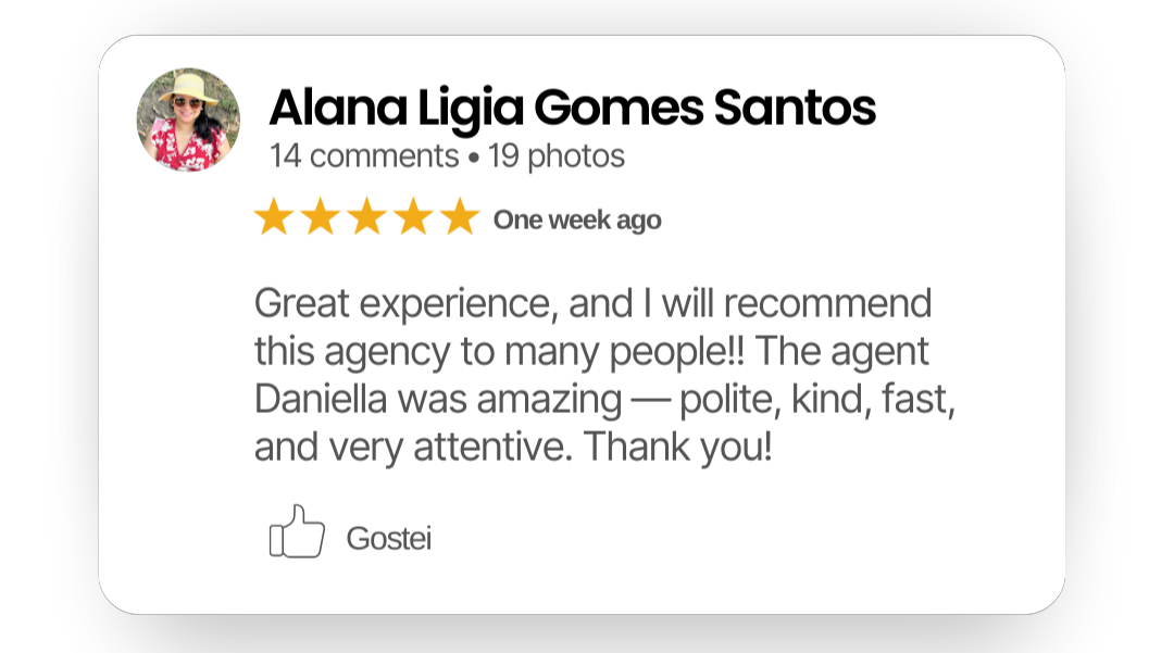“I loved the general experience at Bússola. The service is super personalized and quick, and the prices are excellent. They took care of everything for me, so I didn’t have to worry about anything. Congratulations to the entire team, I’ll definitely travel with you again!”